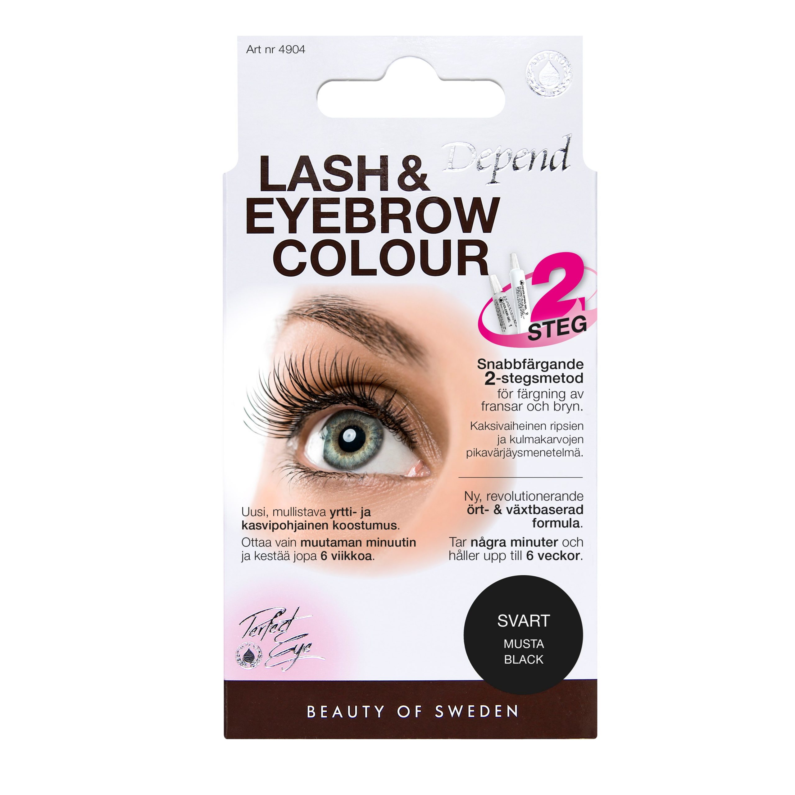 Få fräscha ögon utan makeup med Depend Lash & Eyebrow Colour. Dina ögon är alltid naturligt markerade, direkt på morgonen, när du sportar, solar eller badar. Lash & Eyebrow Colour har en ny och revolutionerande ört- och växtbaserad formula som innehåller bl.a. rölleka, ringblomma, grönt te och blåbär. Denna unika sammansättning har skapat en produkt som är vattenfast, skonsam att använda, enkel och snabb att applicera och ger en intensiv färg som vara länge. Detta ger också ett intryck av längre fransar och mer markerade bryn. Behandlingen tar bara några minuter och resultatet varar i upp till 6 veckor. Finns i färgerna black, brown black, dark brown och brown