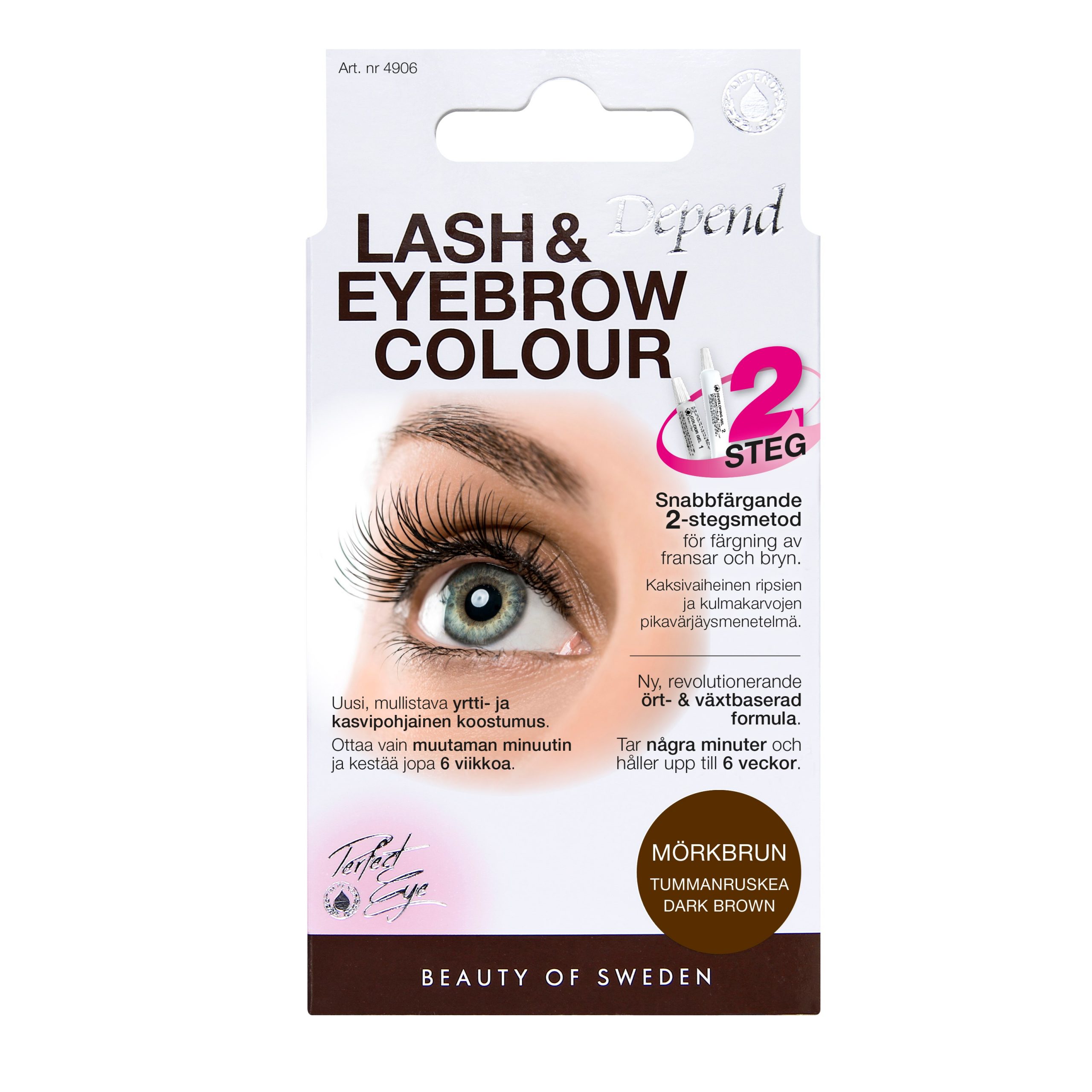 Få fräscha ögon utan makeup med Depend Lash & Eyebrow Colour. Dina ögon är alltid naturligt markerade, direkt på morgonen, när du sportar, solar eller badar. Lash & Eyebrow Colour har en ny och revolutionerande ört- och växtbaserad formula som innehåller bl.a. rölleka, ringblomma, grönt te och blåbär. Denna unika sammansättning har skapat en produkt som är vattenfast, skonsam att använda, enkel och snabb att applicera och ger en intensiv färg som vara länge. Detta ger också ett intryck av längre fransar och mer markerade bryn. Behandlingen tar bara några minuter och resultatet varar i upp till 6 veckor. Finns i färgerna black, brown black, dark brown och brown