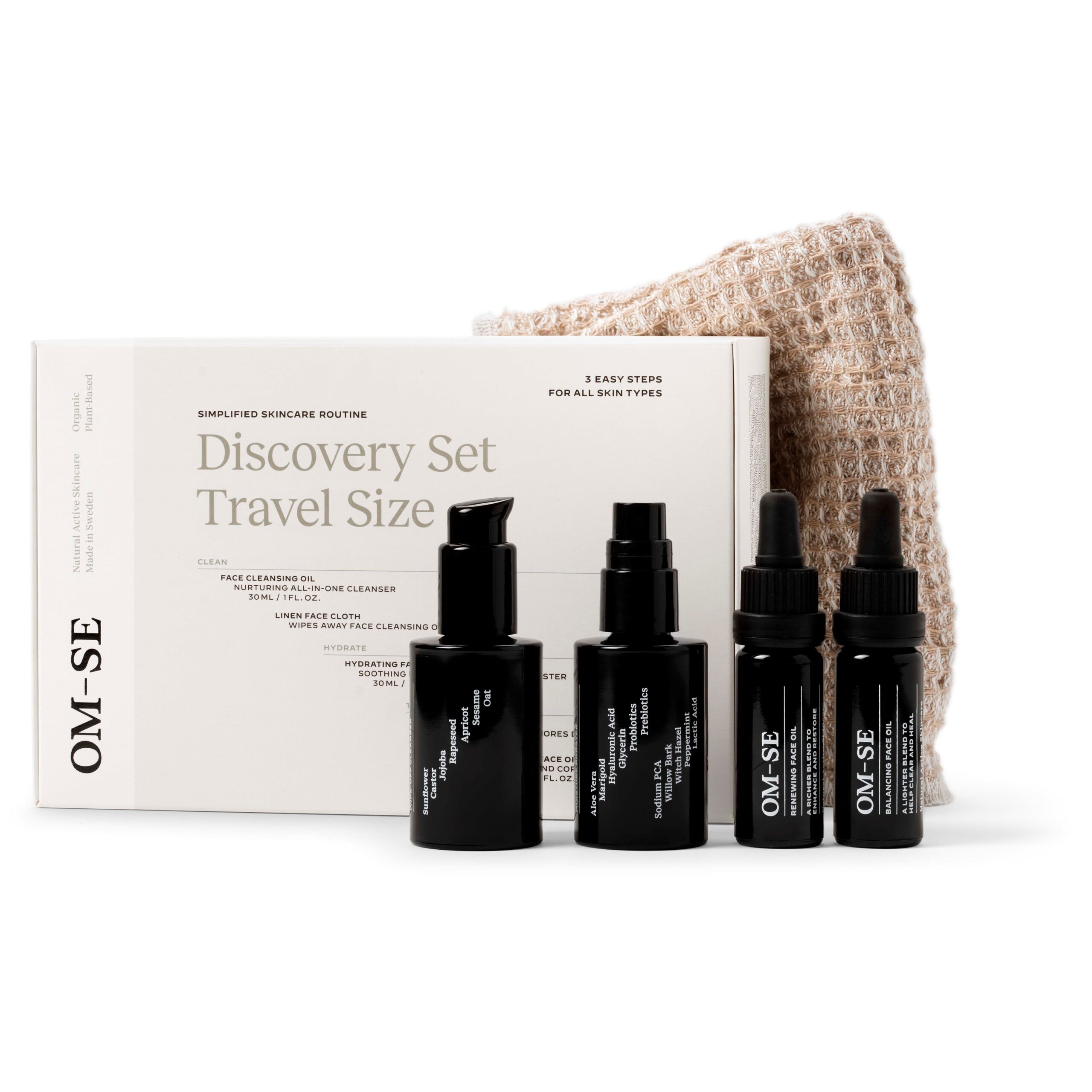 OM-SE Discovery Set är ger din hud komplett näring och återfuktning i 3 enkla steg. Denna resultatinriktade naturliga hudvårdsrutin stärker hudbarriären, främjar kollagenproduktionen, slätar ut fina linjer, förbättrar elasticiteten, stimulerar hudcellsförnyelse, balanserar talgproduktionen, och ger en din hud en jämna hudton och hälsosam lyster. Discovery Set innehåller alla OM-SEs produkter i travel-size och är perfekt som introduktion till en ny, smartare hudvårdsrutin. OM-SEs 3-stegsrutin ersätter 13 vanliga produkter. Du kan nu säga hejdå till ögonmakeupborttagare, förrengöring, ansiktstvätt, ansiktsvatten, essens, ansiktsserum, fransserum, brynserum, fuktkräm, dagkräm, nattkräm, ögonkräm och setting spray.Tillverad i Sverige av 100 % ekologiska, växtbaserade, naturligt aktiva ingredienser, omsorgsfullt utvalda för dess prestanda. – Resultatinriktad- Multifunktionell- Ekologisk, växtbaserad- Utan utfyllnadsingredienser och onödiga tillsatserFace Cleansing OilVårdande och skonsam rengöring som gör din hud mjuk och skyddar hudbarriären. Löser upp vattenfast makeup och ger näring åt dina fransar och bryn.Linen Face ClothAnvänds för att torka av rengöringsoljan. 100 % GOTS-certifierat linneHydrating Face MistLugnande pre- och probiotisk aloevera-baserad fuktmist. Tillför huden fukt på flera nivåer med. Innehåller läkande ringblomma, naturlig salicinsyra från pilbark, antiporsammandragande trollhassel,Balancing Face OilSnabbabsorberande botanisk ansiktsoljeserum med antiimflammatoriska egenskaper, reglerar talgproduktionen, jämnar ut hudtonen och påskyndar cellåterbildningen. Passar normal till fet hud.Renewing Face Oil Återuppbyggande och vårdande botaniskt ansiktsoljeserum som stärker hudens elastisitet och främjar kollagenproduktionen. Perfekt för torr och mogen hud.Användning:Steg 1. CLEANMassera in 2-4 pump av ansiktsrengöringsoljan på torr hud. Detta är en allt-i-ett rengöring, du behöver ingen makeup remover eller ytterligare rengöringssteg. Blöt linneduken i varmt vatten och torka försiktigt av oljan från huden.Steg 2. HYDRATEHuden behöver fukt för att kunna absorbera ansiktsoljan, och Hydrating Face Mist gör just det! Spraya direkt på rengjord hud och/eller i handflatan.Steg 3. TREATApplicera några droppar ansiktsolja i handflatan. Blanda med misten i handflatan, eller applicera på ditt redan mistat ansikte. Et voilà – klart!VILKEN ANSIKTSOLJA?Renewing Face Oil är vår rikare olja, som stärker och återställer torr hud. Balansing Face Oil är lättare alternativ som balancerar fet hud. Hitta din favorit genom att prova båda. Du kan till och med göra din egen unika blandning genom att använda några droppar av det ena och/eller det andra.