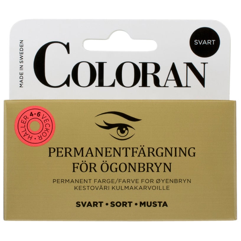 AllmäntAnvändningIngredienserColoran PermanentfärgEn permanent färg som hjälper dig att framhäva bryn, och som håller länge. Idealisk om du inte vill använda smink, sportar mycket eller ska på semester. Få oemotståndligt synliga bryn dag som natt. Innehåller:Colorancrème , 6 gHydrogen Peroxide, 8 mlEn behållare att blanda i.En plastpinne att blanda med.Finns tillgänglig i tre nyanser:Svart är en klassisk färg bland färger för ögonbryn, färgar alla typer av hår till en djup och ren svart färg.Brun har en mörk, täckande ton som lämpar sig för ganska ljust bruna ögonbryn. Den naturliga färgen ger ett intensivt djup.Cendrè är lämplig för att diskret framhäva ljusblonda eller ljusbruna ögonbryn och undviker den skarpa kontrast som sker vid användning av mörkare färger som svart eller brunt.AnvändningKläm ut 1-2 cm Colorancrème och 5 – 10 droppar Hydrogen Peroxide vätska i behållaren, och blanda med plastpinnen. Ju fler droppar av vätskan, desto mer koncentrerat och kortare verkningstid. ÖgonbrynApplicera med plastpinnen så att varje hårstrå täcks noga. Låt verka 5-30 minuter, beroende på vilken nyans du vill ha. Ju längre tid desto mörkare resultat. Tvätta bort med vatten och mild tvål.IngredienserObservera att ev. innehållsförteckning är hämtad från produkten eller levererad av tillverkaren vid produktinläggning. Produktens innehåll kan i sällsynta fall uppdateras i efterhand. Vid allergier eller överkänslighet, vänligen verifiera på produkten innan användning eller kontakta kundtjänst.Tänk på att alltid när du testar en ny produkt, applicera på en mindre yta (exempelvis handleden) för att kontrollera eventuell överkänslighet innan användning.